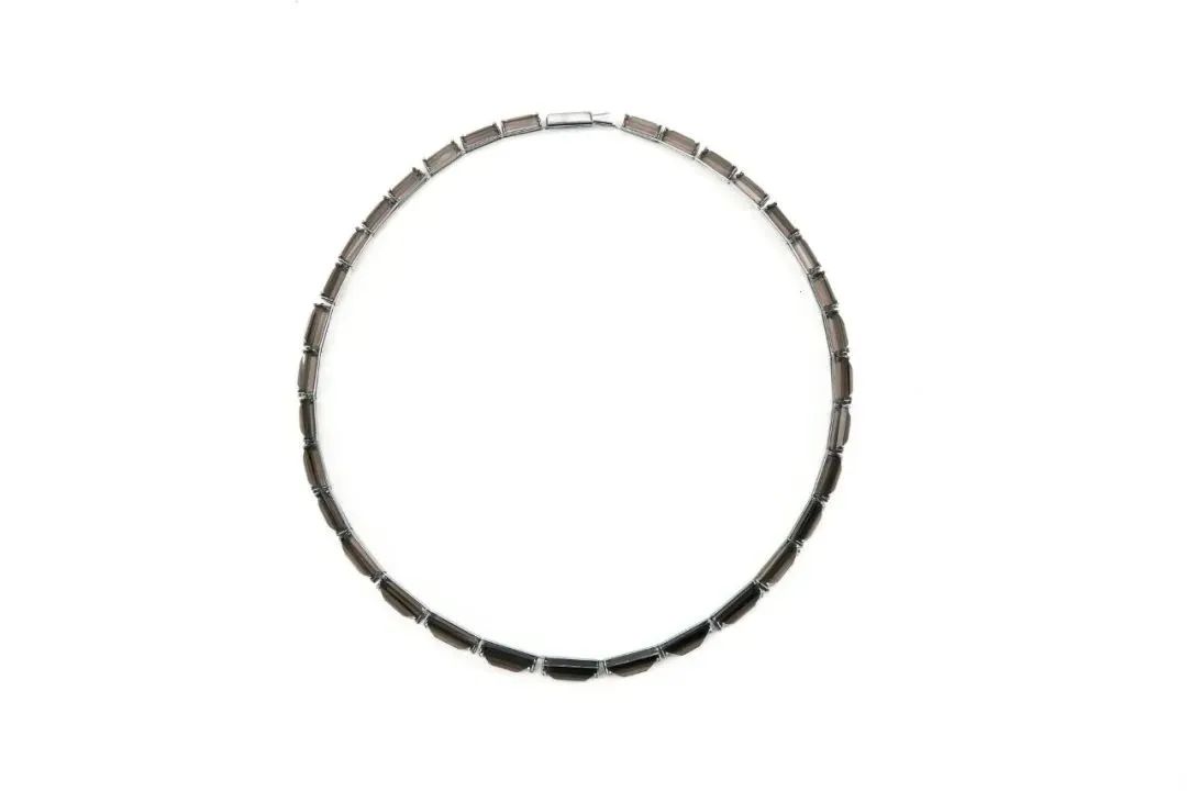 在她的作品集中,洛伊絲融入了類(lèi)似腳手架、梁和工業(yè)結(jié)構(gòu)的元素,以不同的角度鑲嵌石頭。通過(guò)利用煙熏石的獨(dú)特特性,她實(shí)現(xiàn)了類(lèi)似黎明的漸變效果。長(zhǎng)方形石頭的幾何切割增強(qiáng)了它們的光澤,而不銹鋼結(jié)構(gòu)則為佩戴者提供支撐。