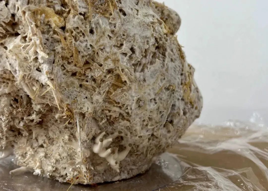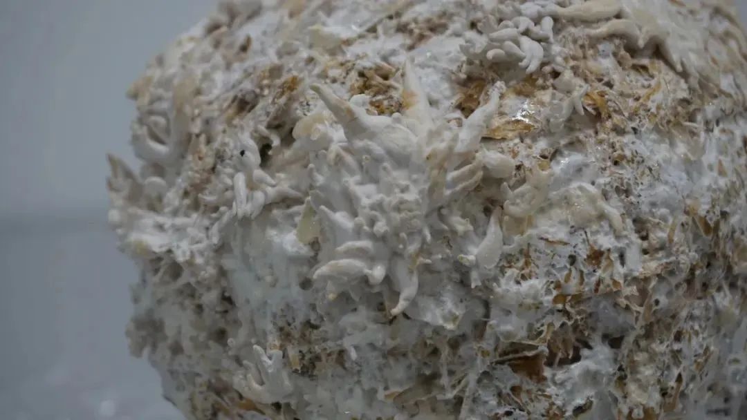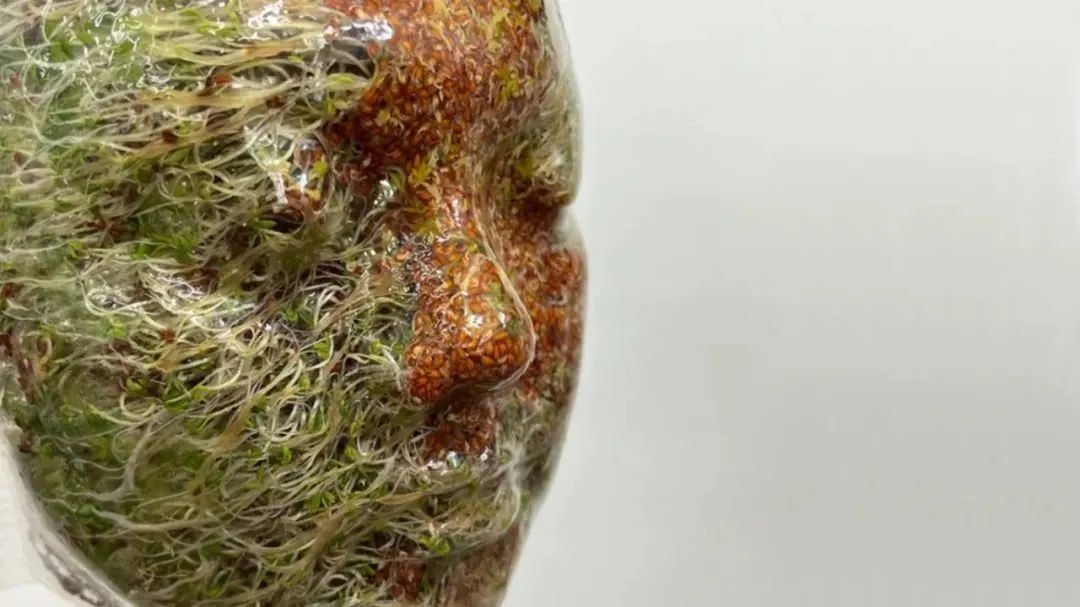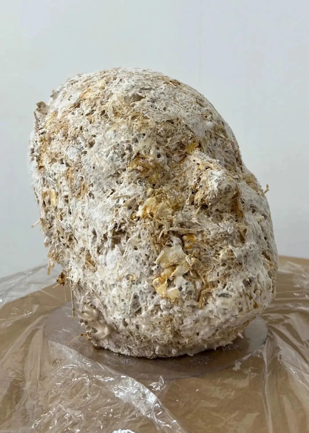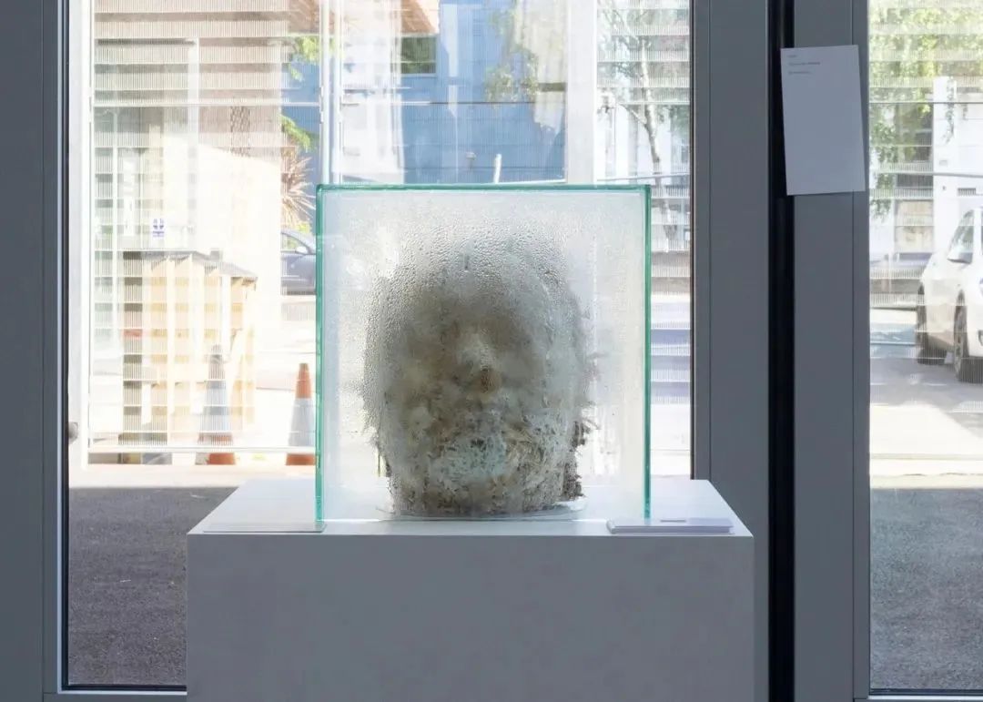 Continuu是一件由活的牡蠣菇菌絲體制成的藝術家頭像雕塑。這件作品是葉舍對生與死循環(huán)性質的反思;理解并接受,為了在這個星球上維持自身,我們應該維護作為整體存在的網(wǎng)絡,而我們也是其中的一部分。這個雕塑是活的,將會繼續(xù)生長出可以收獲和食用的蘑菇。