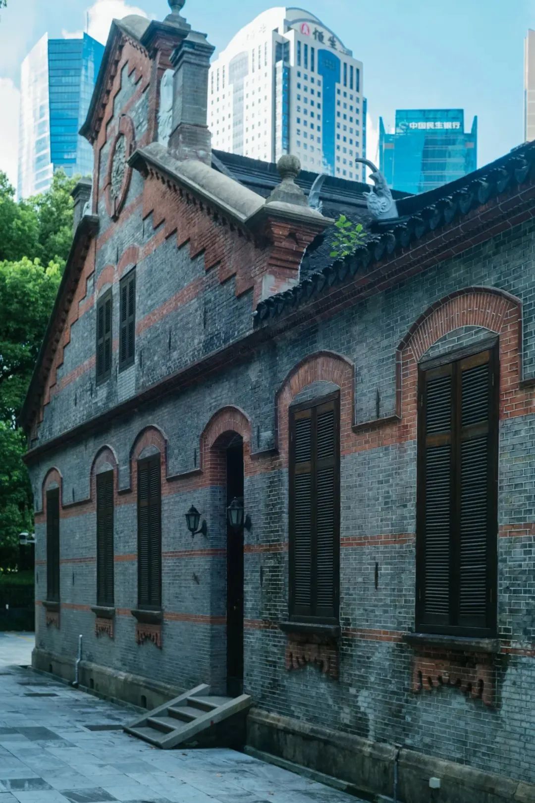 其次,建筑所在的陸家嘴地區(qū)也是一個“劇場”。與上海老城區(qū)的傳統(tǒng)石庫門和典型弄堂社區(qū)截然不同,僅僅幾十年間,陸家嘴已被現(xiàn)代化的辦公樓、購物中心和高檔住宅所覆蓋,其外立面被現(xiàn)代化的玻璃幕墻所包裹。在吳昌碩紀(jì)念館的中央庭院,我們可以看到一個近乎超現(xiàn)實的景象——傳統(tǒng)民居飛檐的背后,上海最高的三座摩天大廈,金茂大廈、上海環(huán)球金融中心和上海中心大廈,直插云霄。在古老宅邸和現(xiàn)代高樓之間,上演了一場關(guān)于古與今、動與靜的深刻對話。