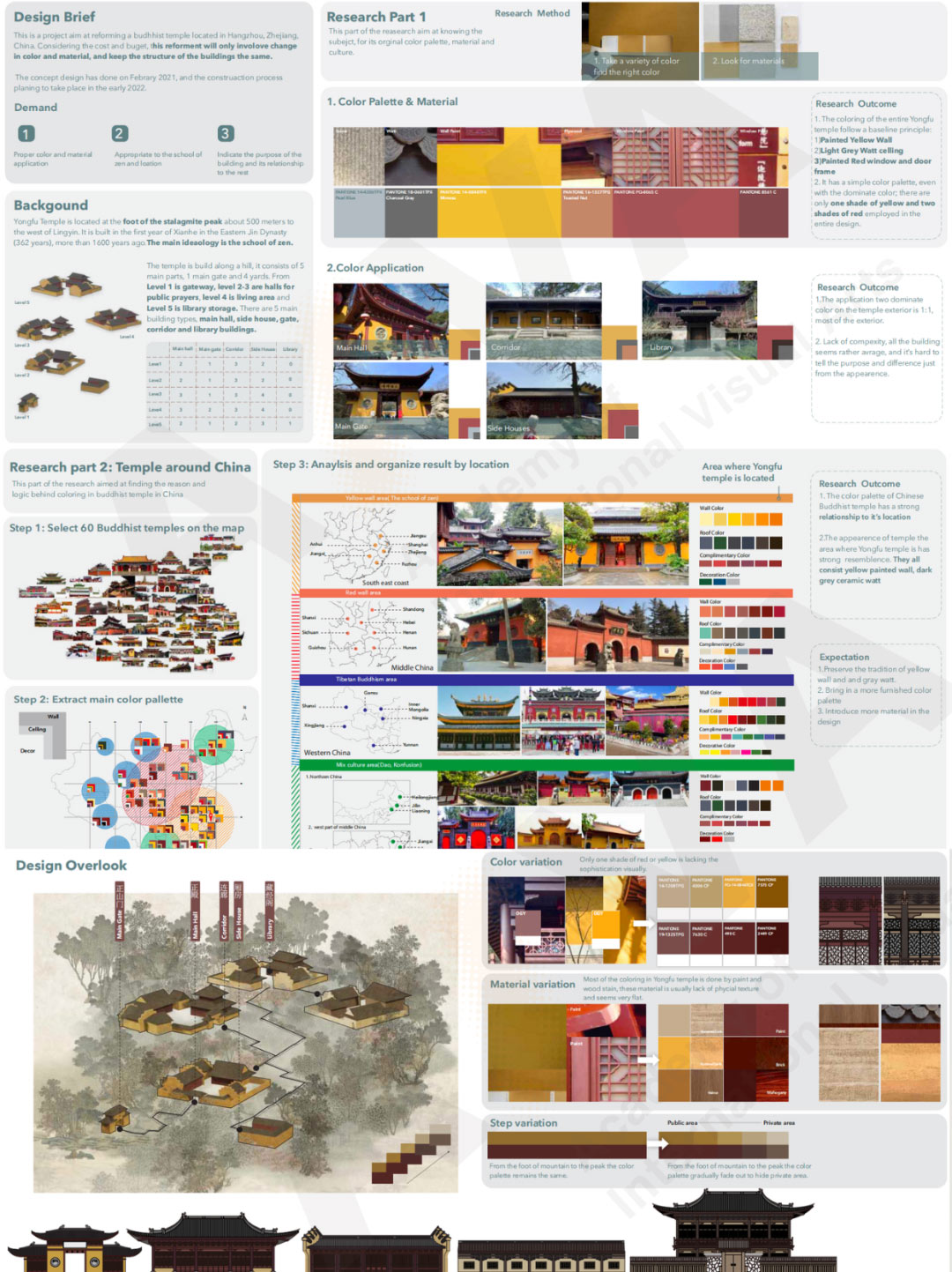 《永福寺色彩改革》是一個旨在改造位于中國浙江杭州的佛教寺廟的項目。考慮到成本和預算,這次改造將只涉及顏色和材料的變化,并保持建筑物的結構不變。概念設計已于2021年2月完成,施工過程計劃于2022年初進行。