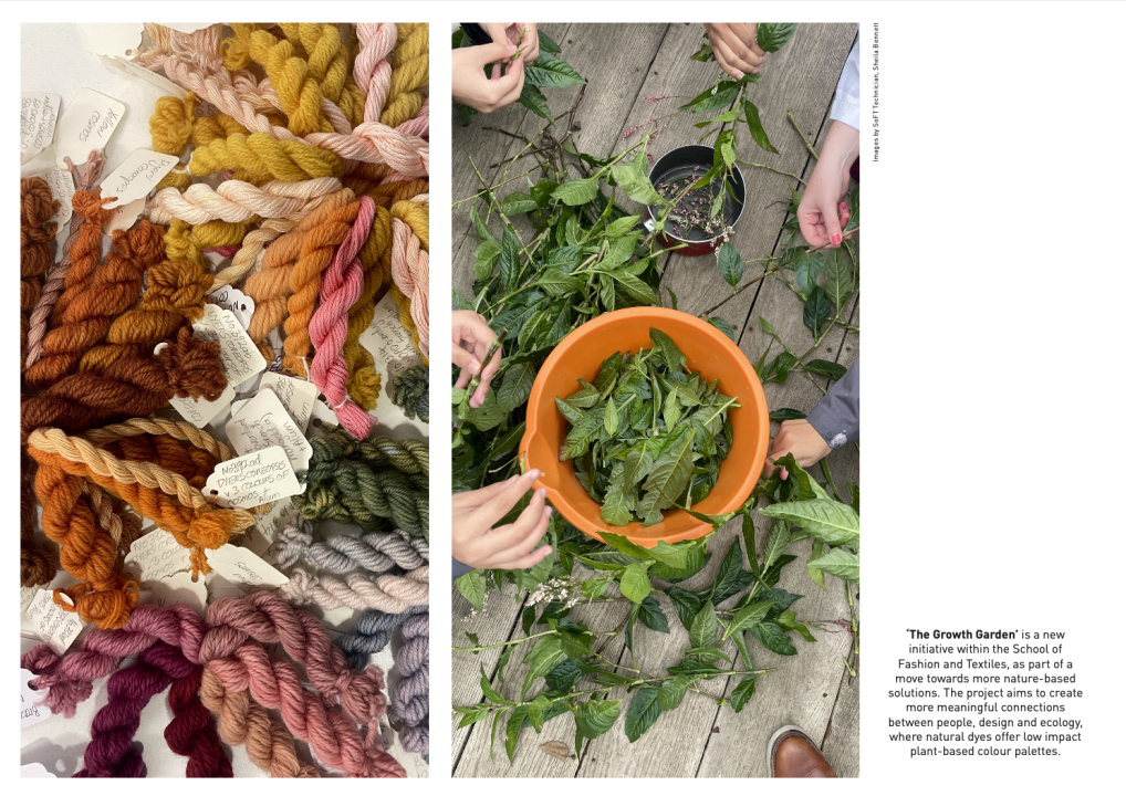 循環(huán)設(shè)計(jì)工坊 :校內(nèi)“植物染料花園”與伯明翰植物園合作,實(shí)現(xiàn)從茜草種植到廢棄織物酶解的全流程實(shí)踐,學(xué)生作品進(jìn)入Pentatonic的"材料銀行"商用系統(tǒng)。