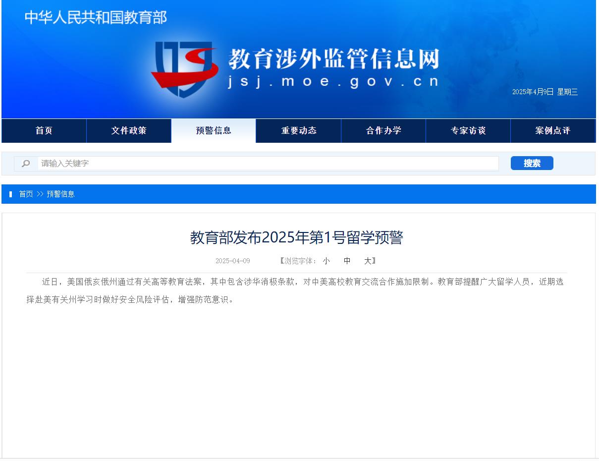 2025年4月,美國(guó)特朗普政府以“國(guó)家安全審查”為由,大規(guī)模取消中國(guó)留學(xué)生簽證,斯坦福大學(xué)、加州大學(xué)系統(tǒng)、哈佛大學(xué)等頂尖院校超300名國(guó)際生F-1簽證遭終止,涉及學(xué)生駕駛違規(guī)記錄、社交媒體言論甚至十年前的酒駕歷史。與此同時(shí),俄亥俄州通過《高等教育增強(qiáng)法案》(SB83),禁止州立大學(xué)接受中國(guó)政府資金,限制與中國(guó)高校的科研合作,并強(qiáng)制要求學(xué)術(shù)機(jī)構(gòu)建立“知識(shí)產(chǎn)權(quán)保護(hù)機(jī)制”。中國(guó)教育部隨即發(fā)布2025年1號(hào)留學(xué)預(yù)警,建議學(xué)生重新評(píng)估赴美風(fēng)險(xiǎn)。