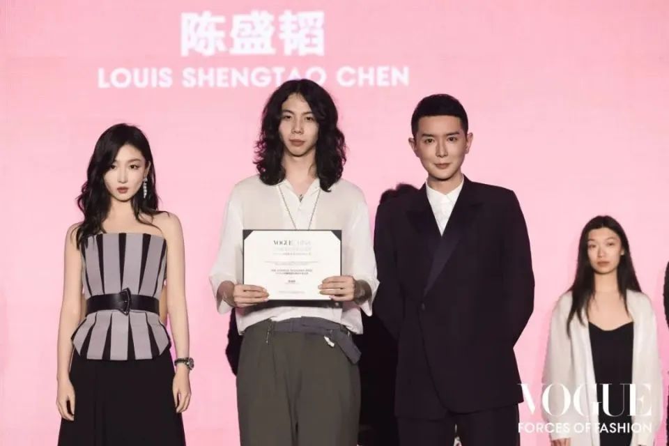 周冬雨與《服飾與美容VOGUE》編輯總監(jiān)Rocco為陳盛韜頒發(fā)“中國新銳時裝設計師大獎”