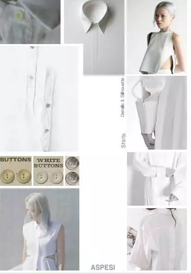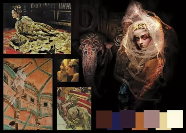 接下來就是設(shè)計作品集中不可缺少的moodboard(情緒板),情緒板是在工業(yè)產(chǎn)品設(shè)計中也經(jīng)常需要用到的,但是在每個專業(yè)中情緒板的作用和包括的內(nèi)容是截然不同的,在服裝設(shè)計中,情緒板可以由inspiration board、color board、material board、detail board等組成。給大家舉的例子就是material board和color board,當(dāng)然moodboard也可以用一張圖來表現(xiàn)。