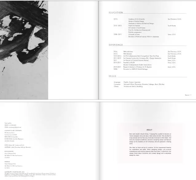 封面過后就是扉頁,很多學(xué)生選擇在這里列出自己的作品集項目或是簡歷都是可以的,可以是設(shè)計師對自己進行了一個介紹,或是羅列一下自己的教育經(jīng)歷和工作經(jīng)驗等。