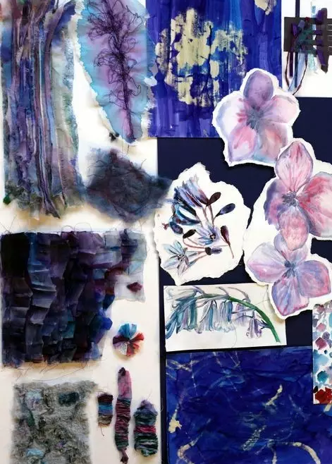 正式展示項目是從research 開始,包含所有靈感,keywords,利用圖片進行展現(xiàn),是設(shè)計過程的第一步。大家可以看到下面這個案例,以花為主靈感源,進行observation drawing,提取花的色彩、元素,結(jié)合所需要的面料,進行一些面料改造,作為Research的第一步。