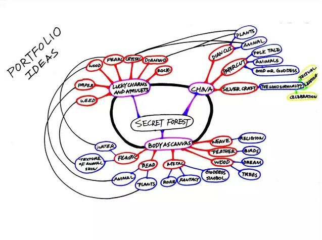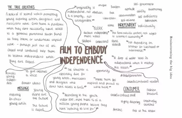 此外Research中還應(yīng)該加入brainstorming、mind-map等思考環(huán)節(jié)。那么什么是mind-map呢?就是圍繞著中心論點展開蜘蛛網(wǎng)般的發(fā)散觀點,所有的小觀點和主論點是有一定聯(lián)系的。