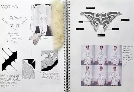下面這個案例相對上圖,Research從服裝結(jié)構(gòu)上加上靈感點(蝴蝶)。這個案例中可以看到學(xué)生運用文字和sketch結(jié)合的方式,來說明自己的研究過程。