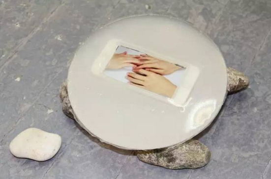iPhone中影像為一雙手觸摸另一雙手。觀眾可捧起硅膠半球觀看影像。