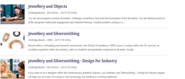 相對(duì)第一個(gè)注重創(chuàng)意的專業(yè);第二行的Jewellery and Silversmithing代稱HND(首飾與銀匠)這是一個(gè)大專學(xué)歷的專業(yè), 學(xué)時(shí)2年,它則是針對(duì)首飾基本制作與銀器制作為主的專業(yè),非常重視金屬工藝技巧。通過2年的學(xué)習(xí)成為相對(duì)傳統(tǒng)的首飾設(shè)計(jì)師,熟練運(yùn)用金屬工藝與銀匠工藝。