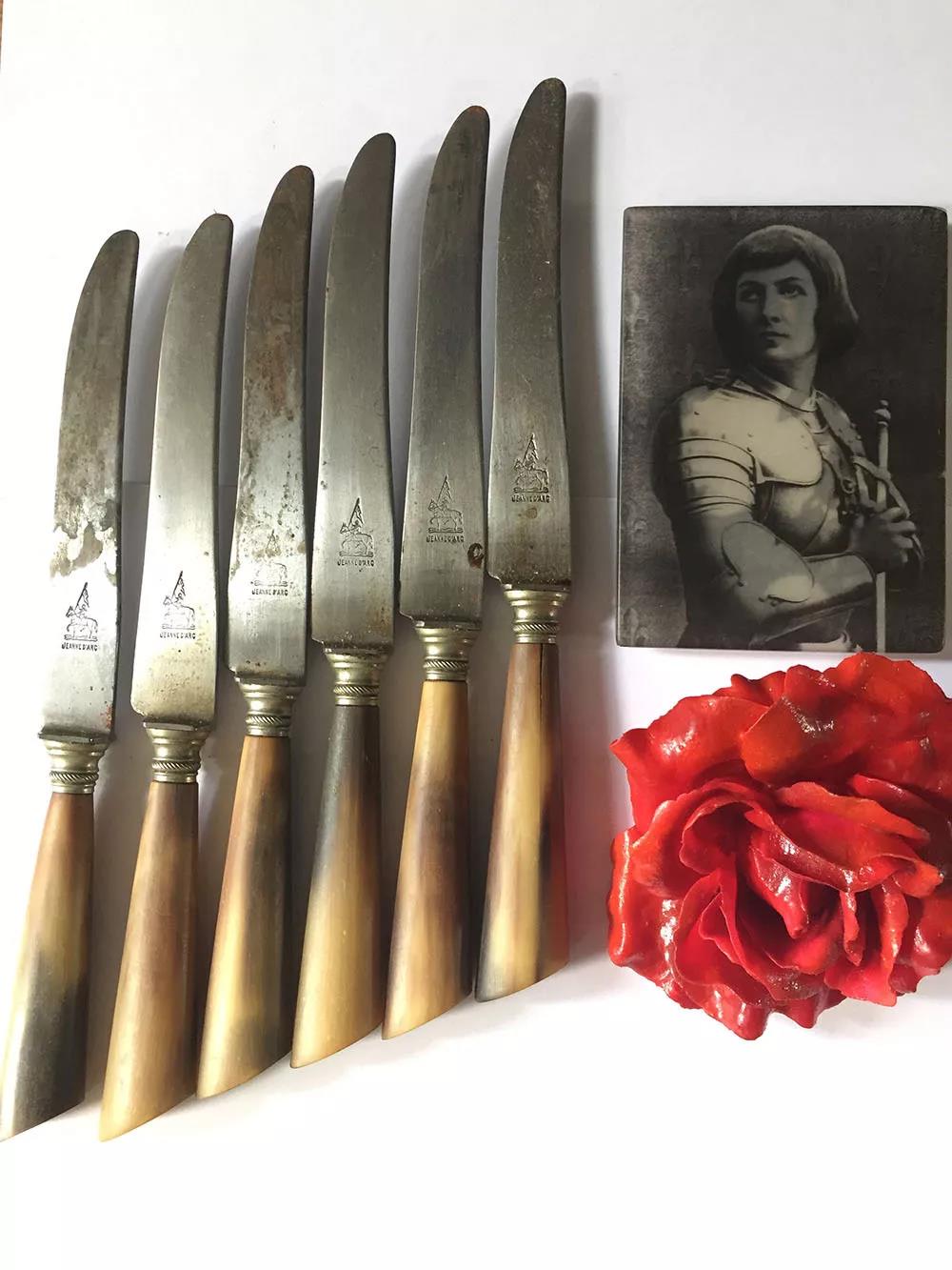 "多年前我在巴黎的舊貨市場找到了這6把鐵刀具的套件。讓我喜出望外的是,刀子上鐫刻了穿著鎧甲的女子、馬背上的騎士及圣女貞德的名字。女子本身、女性性別及女權(quán)符號顛覆了材質(zhì)本身的象征意涵。我刻意使用甜食銹蝕刀身:冰激凌、巧克力、甜酒、蜂蜜、焦糖與稀奶油。穿著鐵盔甲的圣女貞德,是捍衛(wèi)浪漫理想主義的終極女性戰(zhàn)士。由樹脂與銀制成的胸針里有一張40年代法國女星飾演圣女貞德的劇照,是我在南法的另一個舊貨市場淘到的,原本掛在我們倫敦的客廳里。就像我其他的作品,這里被塑化的絲綢玫瑰代表了女性主義、熱情與升華,與鐵金屬材質(zhì)在象征意義與美學(xué)意義上形成了平衡的對立。"