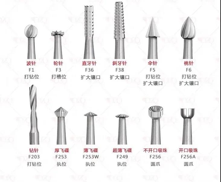 牙針——機(jī)用為主,分平頭與尖頭兩類。主要用于將一些凹凸不平的部位掃順,使得被清理的部位線條清晰。也經(jīng)常使用開夾層、穿孔等。