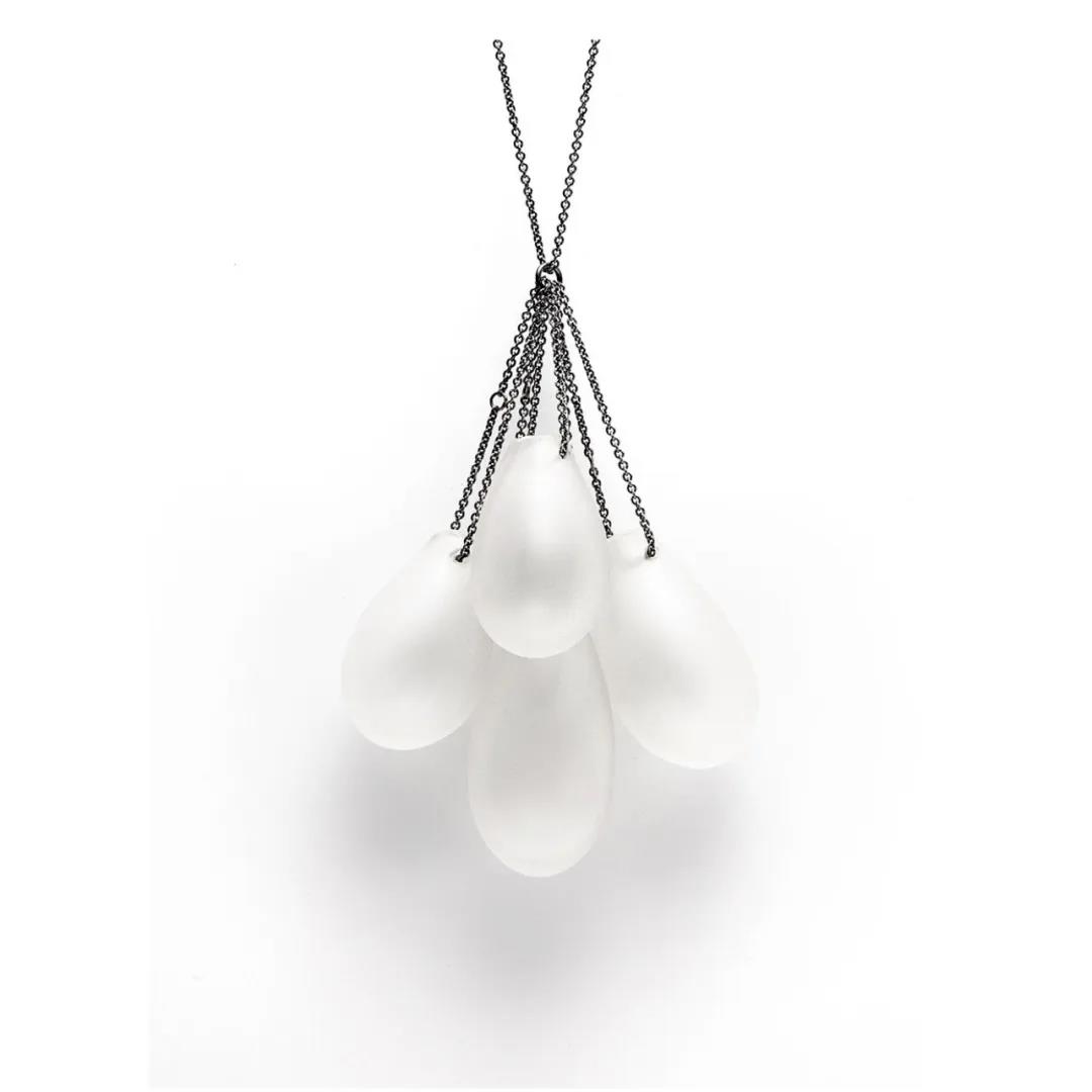 吊墜是由一根銀鏈與四個手工吹制的玻璃元素連接而成。Evert Nijland將空氣吹入玻璃管中,創(chuàng)造出有機形態(tài)。噴砂玻璃元件形成了假想的容器,代指我們目前所處的封鎖的狀況,在這種情況下,我們盡可能多地呆在家里,而外出變得不再隨心所欲。