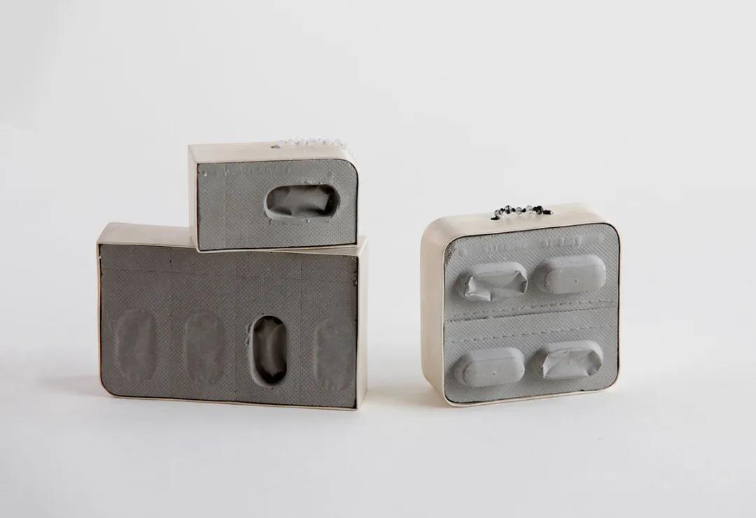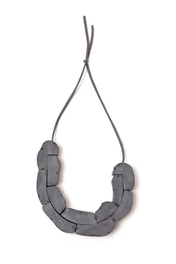 cement, sterling silver, resin, steel, pigment, thread, duct tape, powder coat, wood, and nickel silver