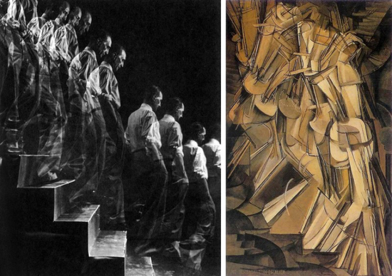 杜尚的《走下樓梯的裸女》呈現(xiàn)了主體“裸女”步下樓梯每一瞬時(shí)間里在空間中留下的“存在”印記,畫面有延時(shí)攝影的逐幀感 圖源:網(wǎng)絡(luò)