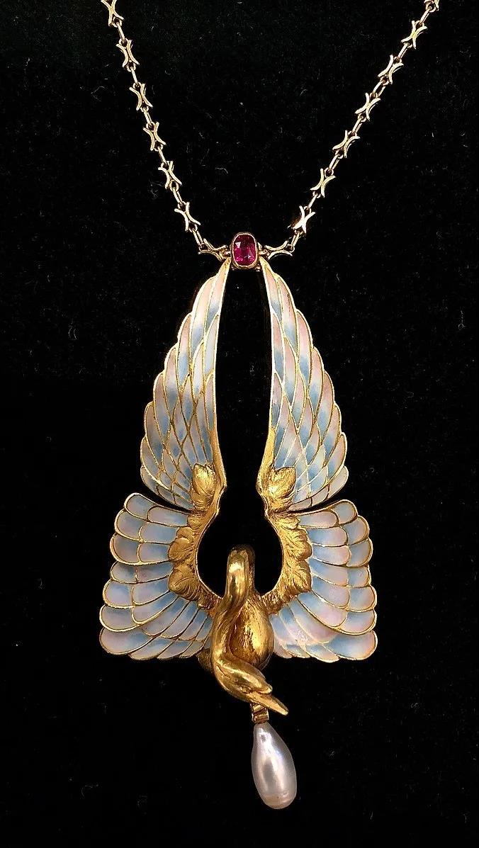 首飾是新藝術(shù)運(yùn)動(dòng)的一大門類。此時(shí)期部分作品是對(duì)于日益大規(guī)模制造的珠寶的回應(yīng),醒目的美學(xué)風(fēng)格與自由靈動(dòng)的形式,靈感來(lái)自自然世界、創(chuàng)新材料和全新的設(shè)計(jì)原則。它以來(lái)自外部的新形式,包括英國(guó)的工藝美術(shù)運(yùn)動(dòng)和日本的藝術(shù),重振了已成為公式化的自然主義。