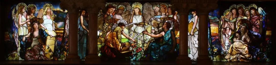 名為 Education/教育的玻璃花窗,位于耶魯大學(xué)Linsly-Chittenden Hall (原Chittenden Hall),由Louis Comfort Tiffany承接創(chuàng)作。畫中的四大天使分別是藝術(shù)、科學(xué)、宗教與音樂(lè)的化身,畫中其他人物也各自代表著不同的美德與價(jià)值,每個(gè)人物所代表的含義顯示在頭頂圣光里的文字中。