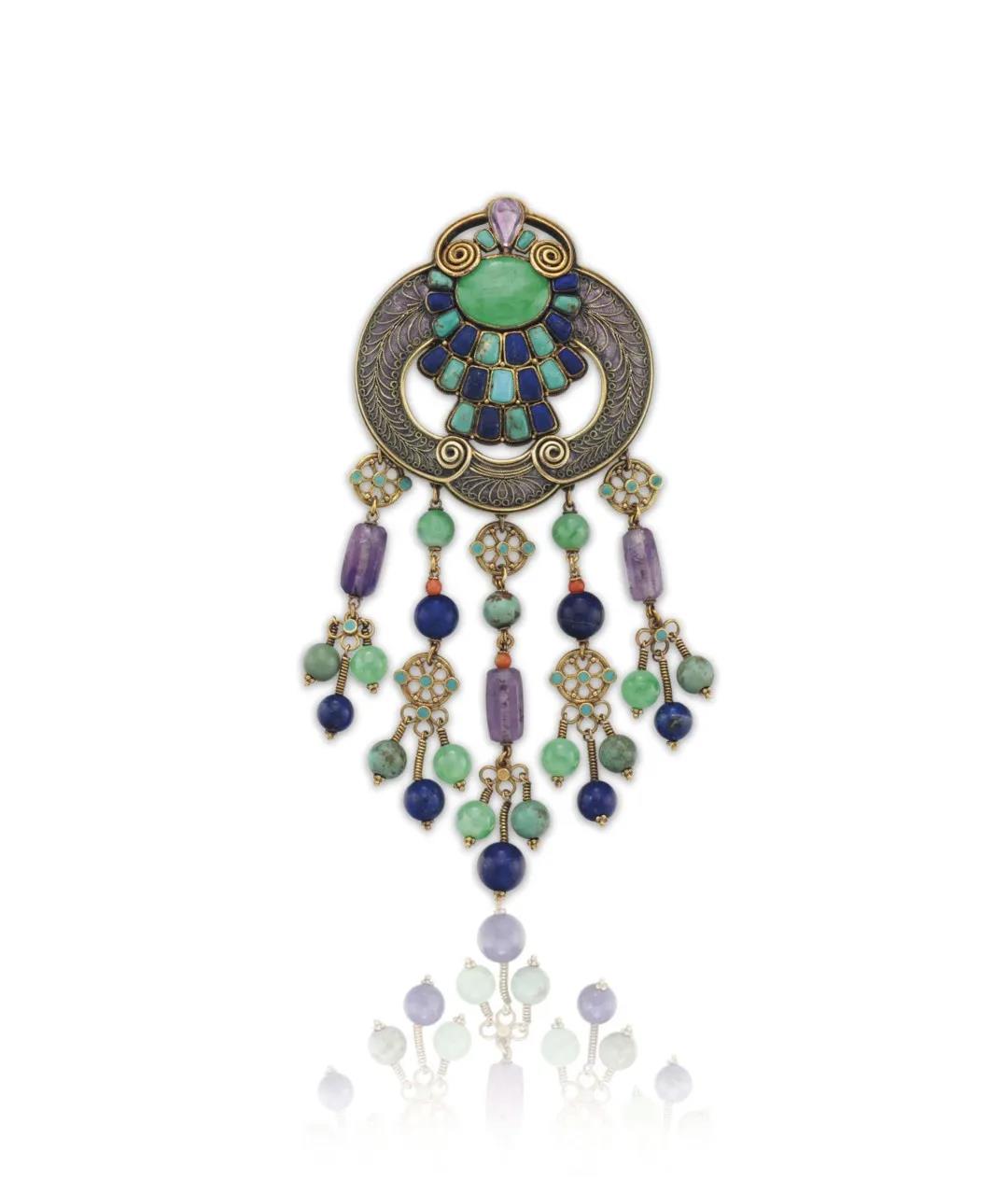 上面這只胸針使用了多種寶石、黃金以及琺瑯。其形式與配色帶有的東方風(fēng)情顯而易見(jiàn)。
