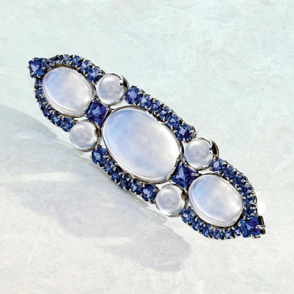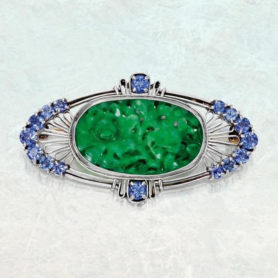 下圖這只胸針則以玉石為中心,將之與白金及藍(lán)寶石搭配,甚至直接以中式玉雕的方式處理玉石,相信在當(dāng)時(shí)的紐約名流貴婦眼中十分富有異國(guó)情調(diào)。