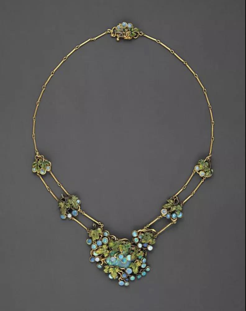 下面這條項(xiàng)鏈由葡萄簇和樹(shù)葉組成,是Louis Comfort Tiffany設(shè)計(jì)最早設(shè)計(jì)的珠寶之一。微小的黑歐珀代表水果的簇類,在金色的綠色陰影下精心地做裝飾,形成細(xì)膩的葉子。蛋白石呼應(yīng)了Tiffany的璀璨光芒,讓人想起他在法夫里爾玻璃的花瓶。其設(shè)計(jì)及有機(jī)形狀的不對(duì)稱性完全符合他對(duì)自然形態(tài)的熱情。