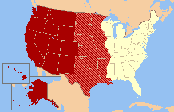 包括加州CA,華盛頓州WA,猶他州UT,科羅拉多州CO,阿拉斯加州AK,愛達(dá)荷州ID,蒙大拿州MT,俄勒岡州OR,懷俄明州WY,亞利桑那州AZ,夏威夷州HI,內(nèi)華達(dá)州NV、新墨西哥州NM