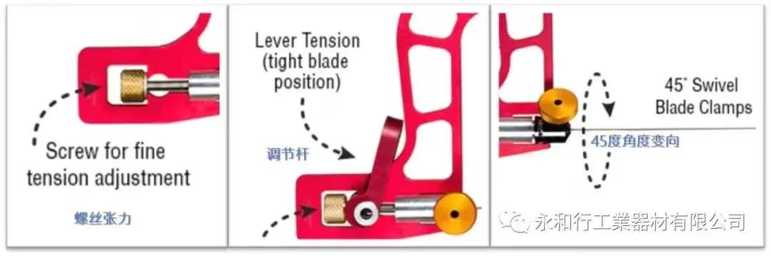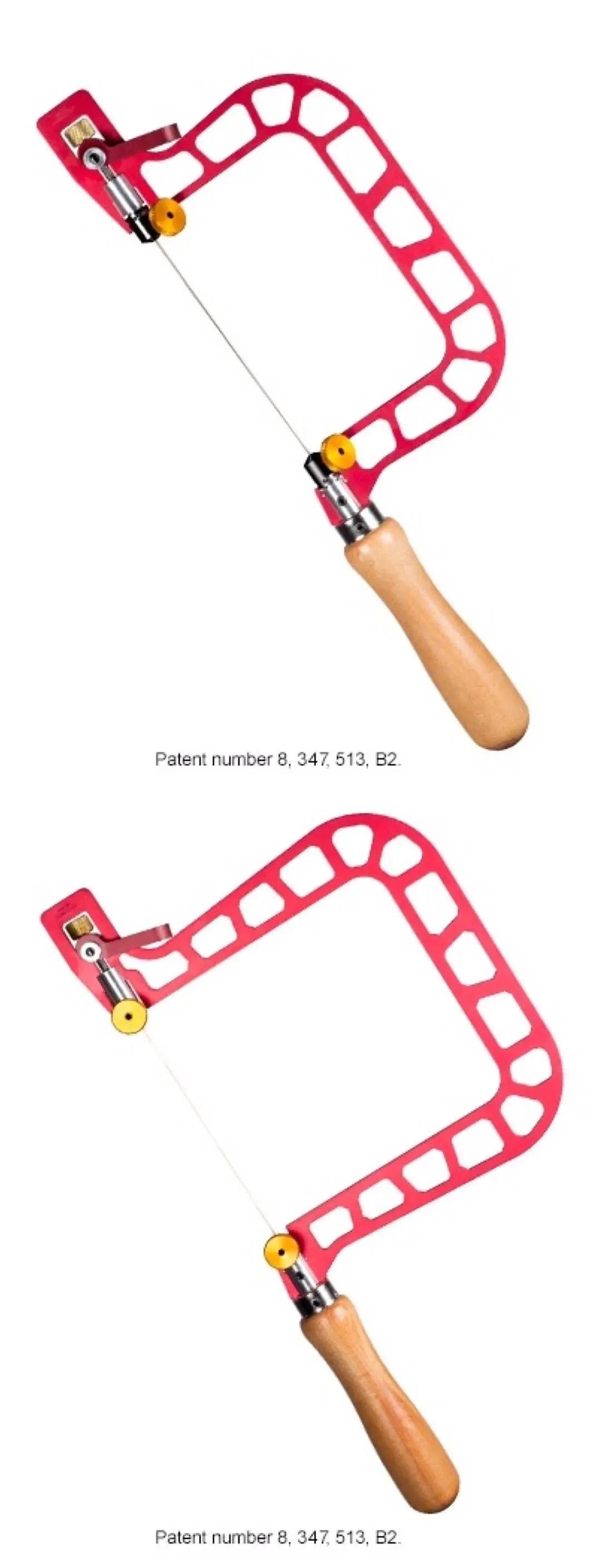 Knew Concepts可以預(yù)先調(diào)節(jié)鋸條間的尺寸和螺絲張力,不需要每次鋸條斷裂或者是移動(dòng)到其他鏤空切割位置時(shí),都將框架頂在軀體和桌子之間。只需要調(diào)節(jié)螺絲張力或者打開調(diào)節(jié)桿即可便利的安裝好鋸條。