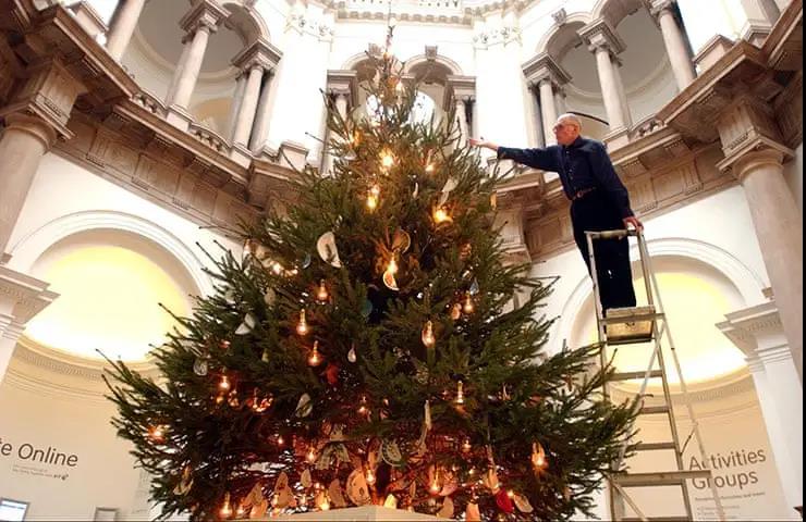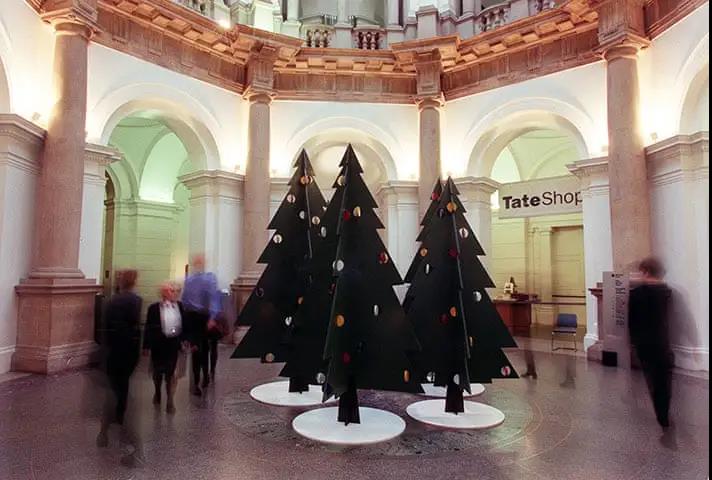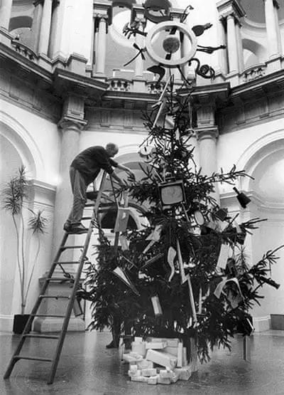 英國雕塑家 Bill Woodrow 是第一個(gè)被泰特美術(shù)館邀請?jiān)O(shè)計(jì)圣誕樹的藝術(shù)家,他的設(shè)計(jì)概念是關(guān)于地球生態(tài),圣誕樹由一個(gè)大的地球儀和用硬紙板制作的地圖模型裝飾。