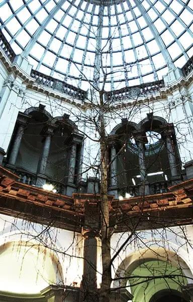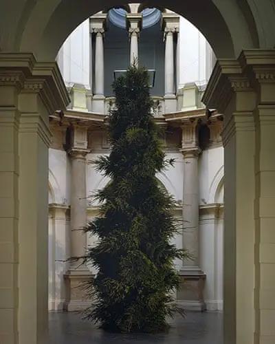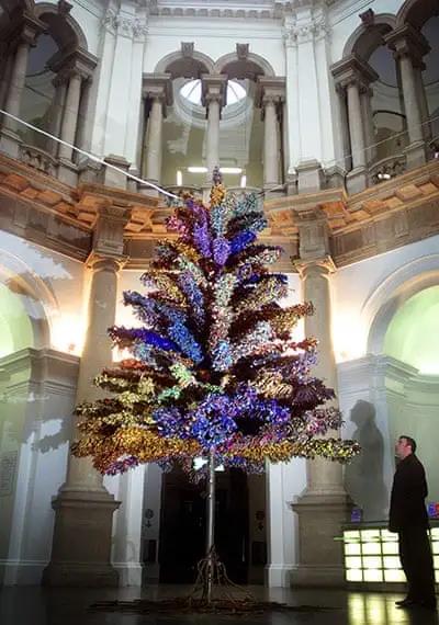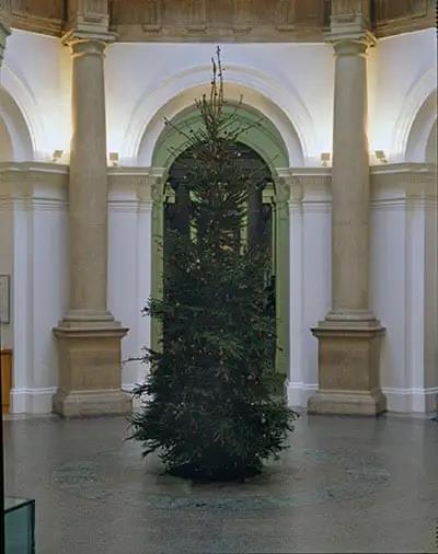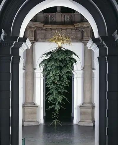 伊朗藝術(shù)家 Shirazeh Houshiary在1993年帶來了經(jīng)典作品,她將整棵圣誕樹倒掛,把平日埋在地下的根莖部分裸露在外面,并用金箔裝飾,十分奪目。Houshiary希望人們認(rèn)識(shí)到松樹是最古老的物種之一,明白根部是它吸收營養(yǎng)、持續(xù)存活的關(guān)鍵。