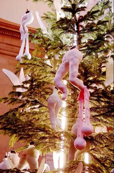 英國藝術(shù)家Sarah Lucas設(shè)計(jì)的圣誕樹浪漫又野蠻,樹枝上掛的是用粉色長襪做成的“殘肢”。