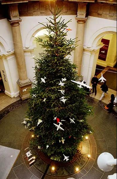 英國藝術(shù)家Fiona Banner放了兩架真的戰(zhàn)斗機(jī)在美術(shù)館里,并在圣誕樹上掛了122件手工制作的白色飛機(jī)模型,她稱其為“地球的和平”。