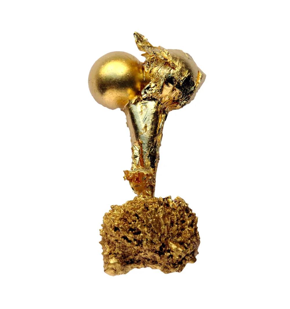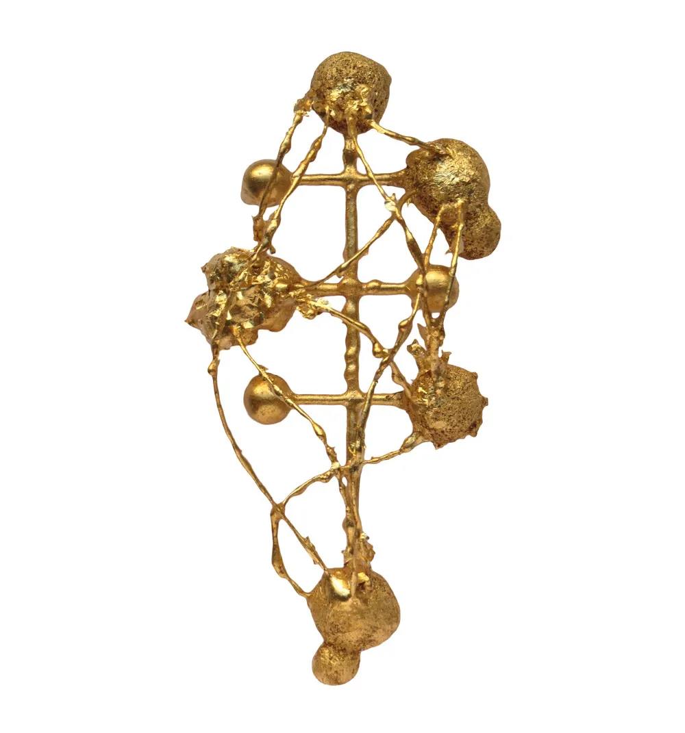 Ruudt Peters的珠寶也有類似的現(xiàn)象,他的作品往往來源于他的個人經(jīng)歷。通過讓金箔原來所裝飾的具有崇拜保護(hù)意義的事物離場,他分離出了金箔的物質(zhì)和符號語言?;仡欉^去,他的作品可能被認(rèn)為是他存在的抽象日記。為了“I AM”系列展覽,他一次又一次地給他的一些舊作品鍍金。