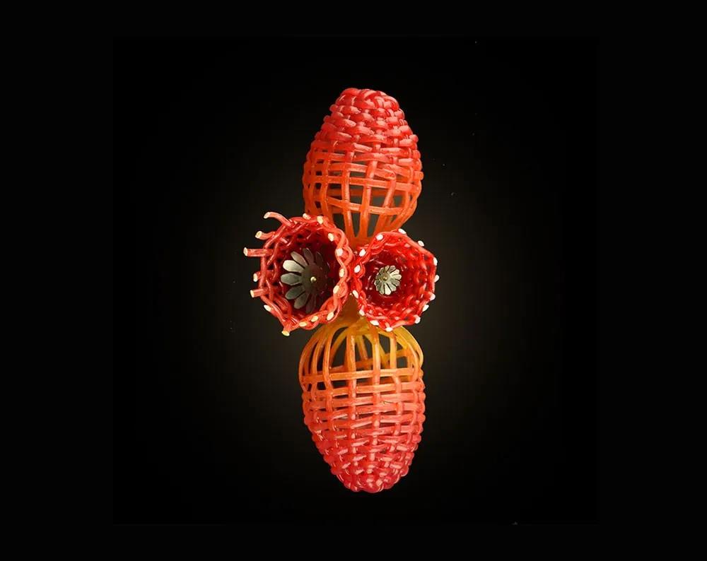但Wang設(shè)法提升整個(gè)女性世界的品質(zhì),她贊美女人的各種形態(tài)。作為一名首飾藝術(shù)家,她嘗試了意大利面的彈性,以及將意大利面煮熟并交織在一起的可能性。組合的結(jié)構(gòu)很牢固,不易斷裂。沒(méi)錯(cuò),Qian選擇了意大利面并煮了它,但卻將其轉(zhuǎn)換成耀眼的首飾,這否定了意大利面的可食用性,將它們呈現(xiàn)為多彩而優(yōu)雅的首飾。