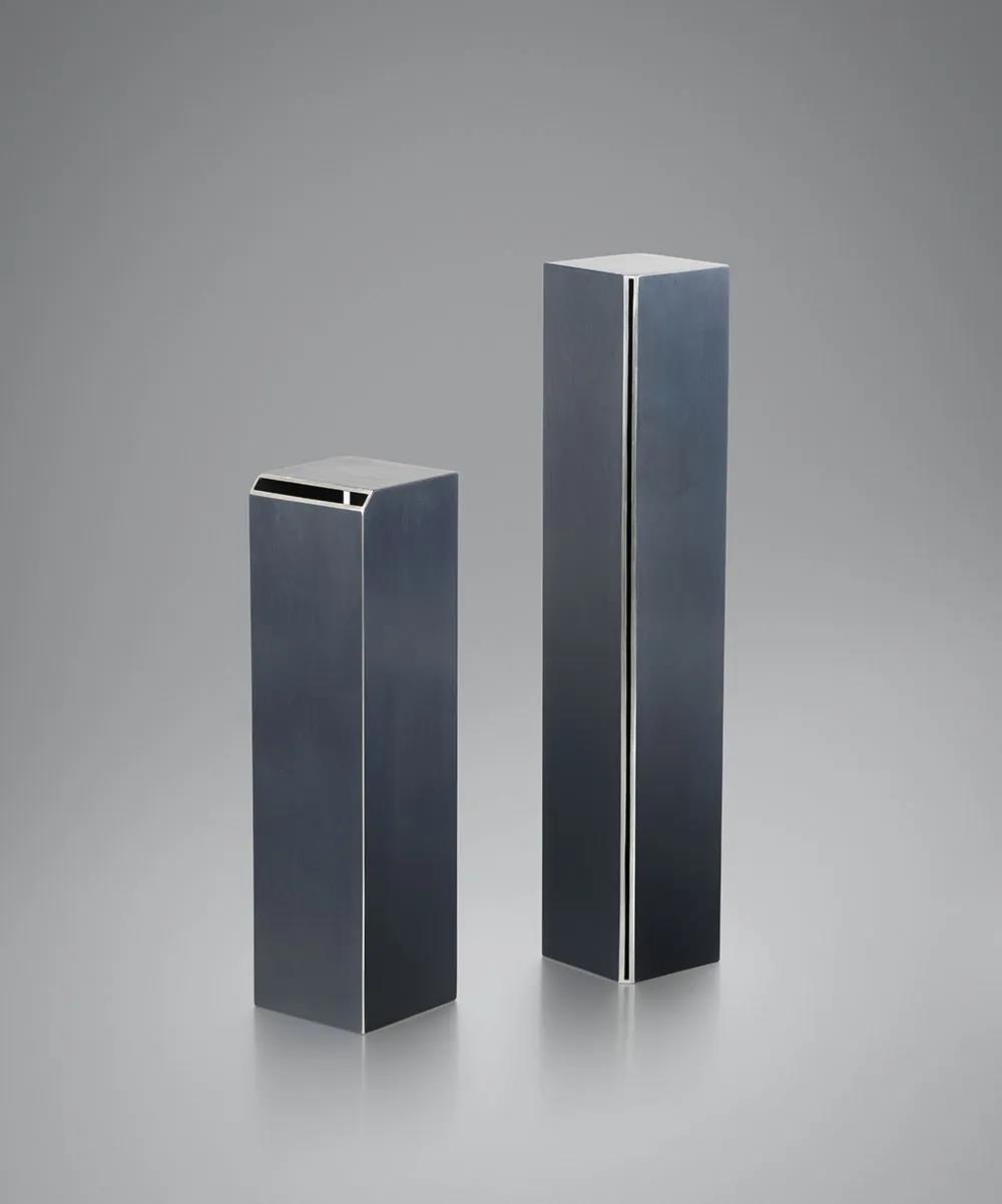 該系列利用邊緣上突出的切口和開(kāi)口作為門(mén),來(lái)揭示和強(qiáng)調(diào)內(nèi)部和外部空間的聯(lián)系。引入光的變化作為催化劑貫穿作品,形成不同的陰影,成為了作品本身多變的回聲。它增強(qiáng)了視覺(jué)沖擊,并質(zhì)疑了作品與周?chē)h(huán)境的關(guān)系。每件作品都是獨(dú)一無(wú)二的,是經(jīng)過(guò)精心控制和設(shè)計(jì)的制作過(guò)程的結(jié)果。所有作品都是用氧化純銀手工制作而成的。
