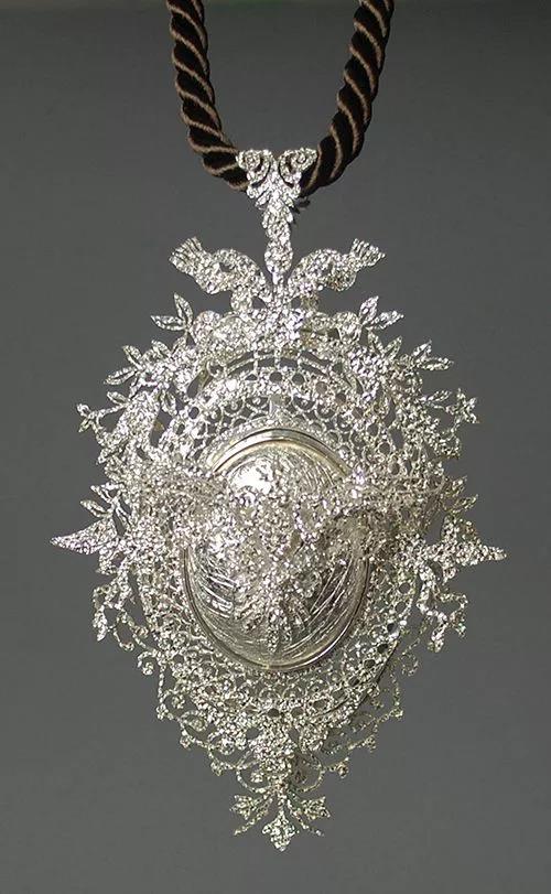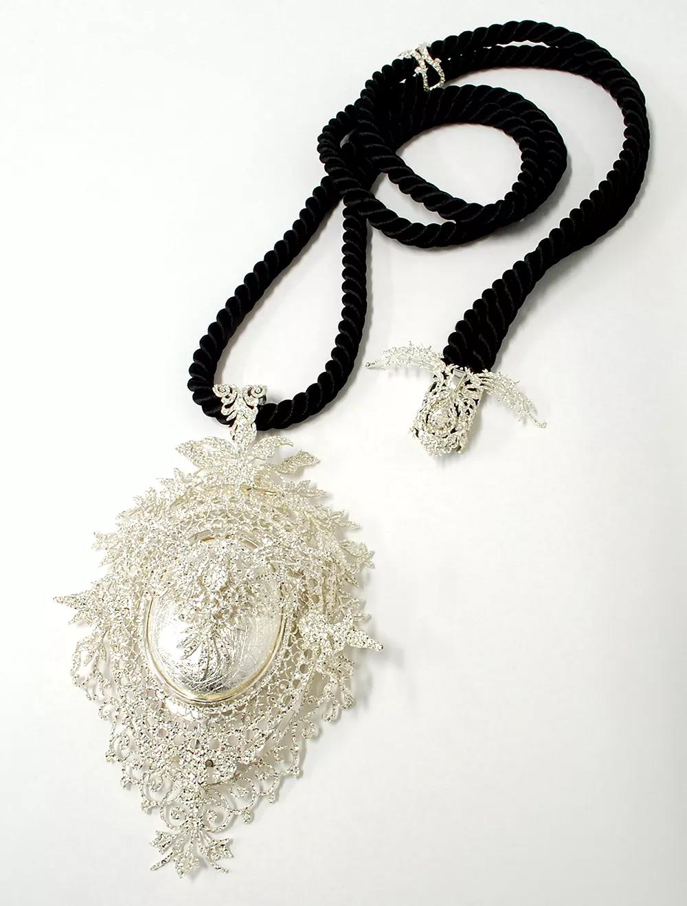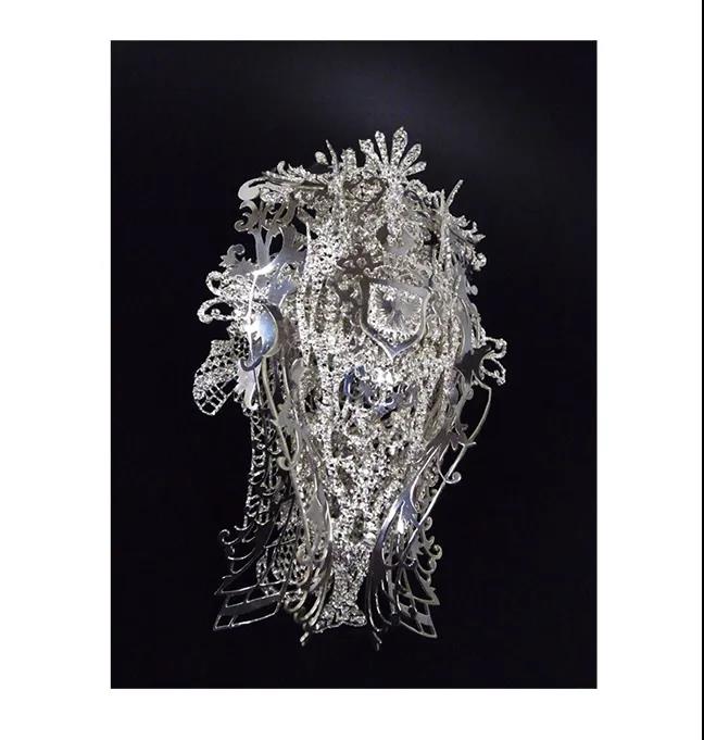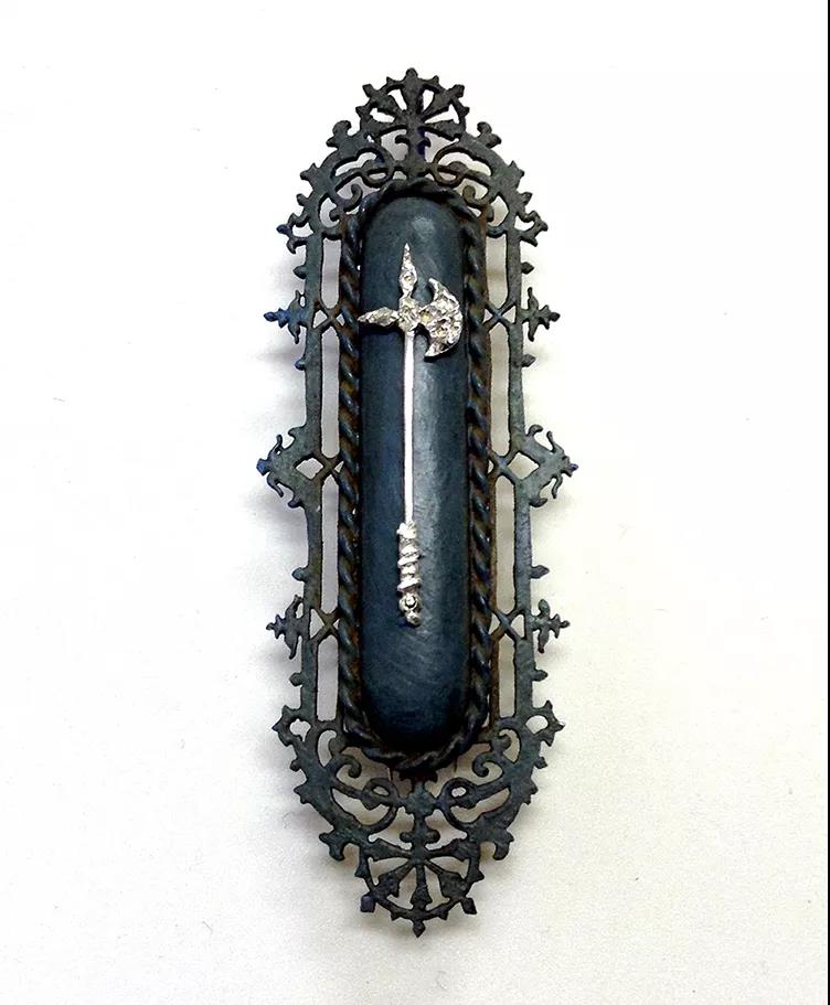 “田口史樹(shù)通過(guò)對(duì)主題和材質(zhì)的巧妙處理,重新詮釋了胸針和吊墜。他的首飾似乎被精美的寶石所迷惑,通過(guò)不同的切割和角度折射出線條,藝術(shù)家通過(guò)將純銀雕鑿成一種模擬鉆石等寶石的光澤來(lái)達(dá)到這種效果。田口對(duì)銀的使用指向首飾價(jià)值的建構(gòu),暗示銀與貴重的巖石一樣光芒四射。田口曾說(shuō):“在不鑲嵌任何寶石的情況下,我常常使用制作寶石的結(jié)構(gòu)來(lái)呈現(xiàn)金屬本身的力量和精致感。”胸針和吊墜類似于家族徽章或盾徽;通過(guò)破壞物質(zhì)象征和清空徽章的肖像,胸針成為超越舊血統(tǒng)的新型關(guān)系的容器。”