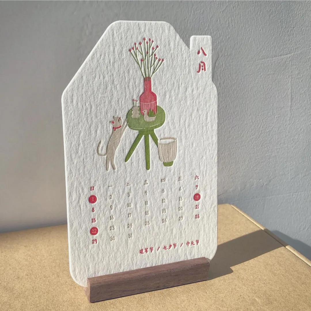 活版印刷月歷的設(shè)計目的則更為商業(yè)化,年月日的排列組合功能性體現(xiàn)地非常強(qiáng)?;畎嬗∷⒃職v的尺寸大多與明信片相似,適合擺放在桌面上或者是貼在墻上,實(shí)現(xiàn)其功能性與裝飾性。