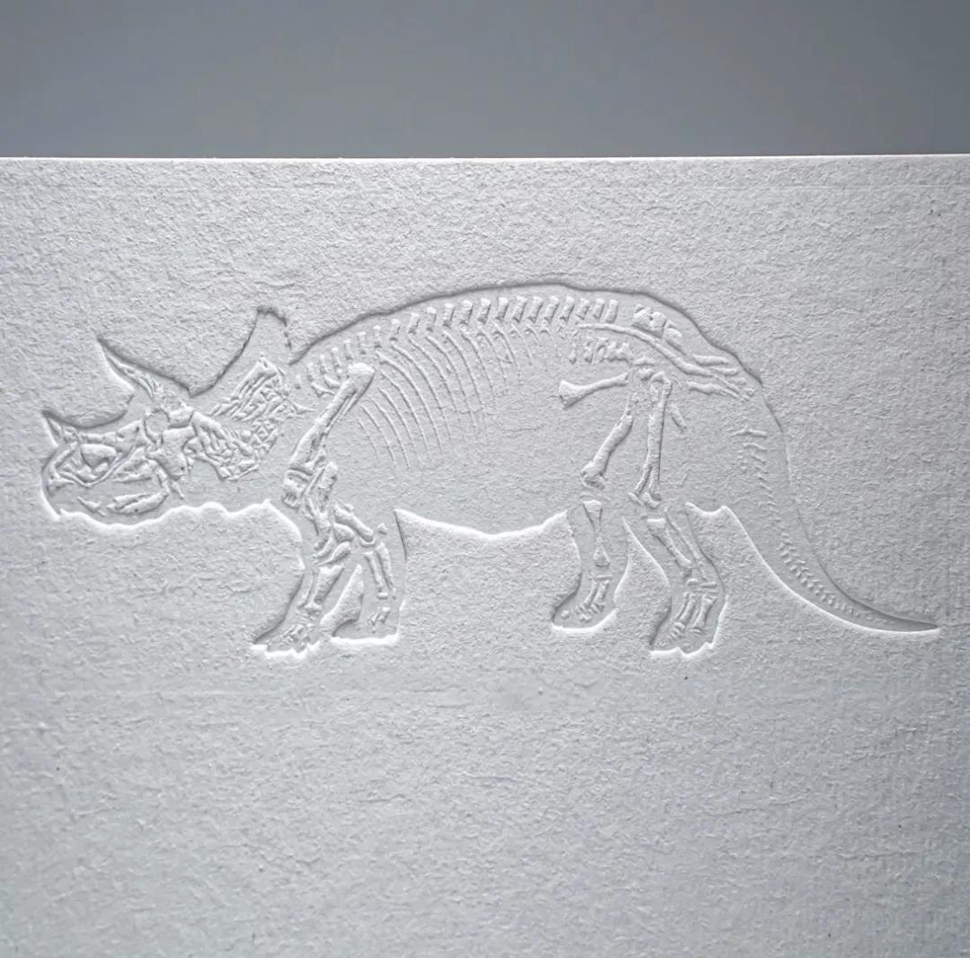 當(dāng)鋅板與紙張在壓力的作用下相會,紙張變形留下可觸摸的痕跡。這種凹凸起伏的變化讓二維的文字或圖案走向三維的狀態(tài),給予了文字一定的立體空間。