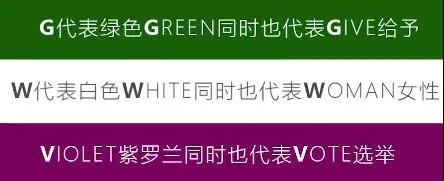 “在20世紀(jì)初的英國(guó),女權(quán)運(yùn)動(dòng)的支持者決定使用綠色(Green)、白色(White)和 紫色(Violet)這三種顏色,作為她們?yōu)樽约籂?zhēng)取政治權(quán)利的“旗幟”。