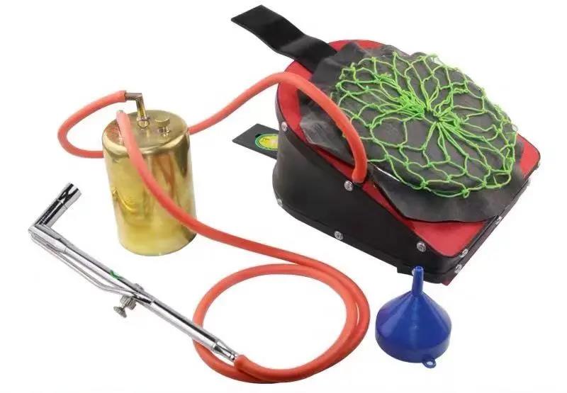 火吹套件由鐵腳風(fēng)球、氣管、油壺、燃料、和火槍等部件,由氣管連接組成,其中鼓風(fēng)器可以是人力腳踏的(如風(fēng)球,又叫皮老虎),也可以是電力的(如氣泵)。
