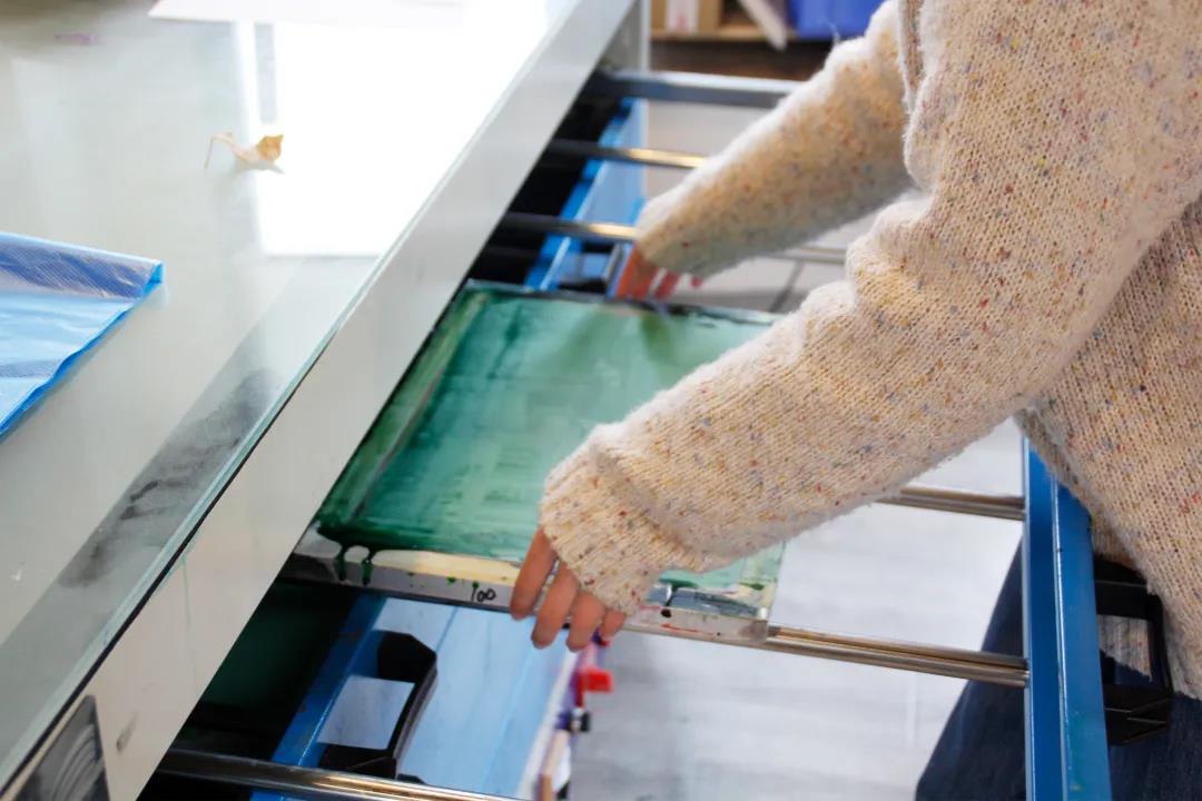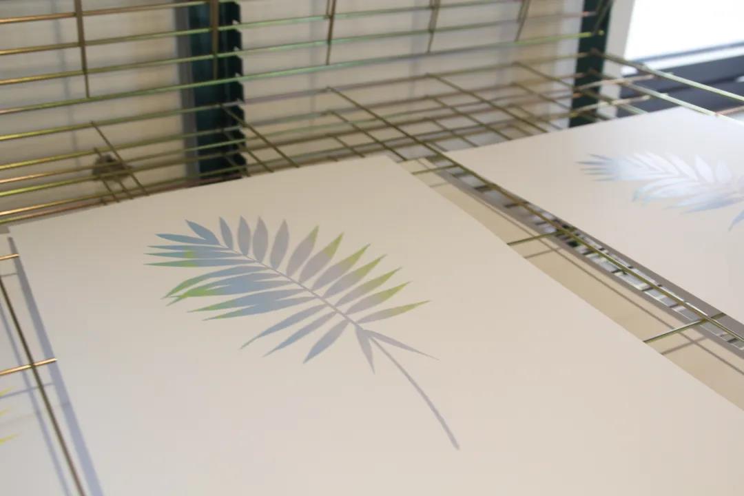 網(wǎng)框反面朝上放入烘箱中遮光烘干,等待曝光制版。葉片替代菲林片起到了遮光的用途,在絲網(wǎng)上留下的自然的氣息。