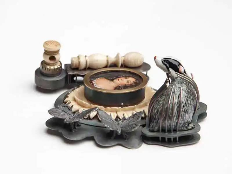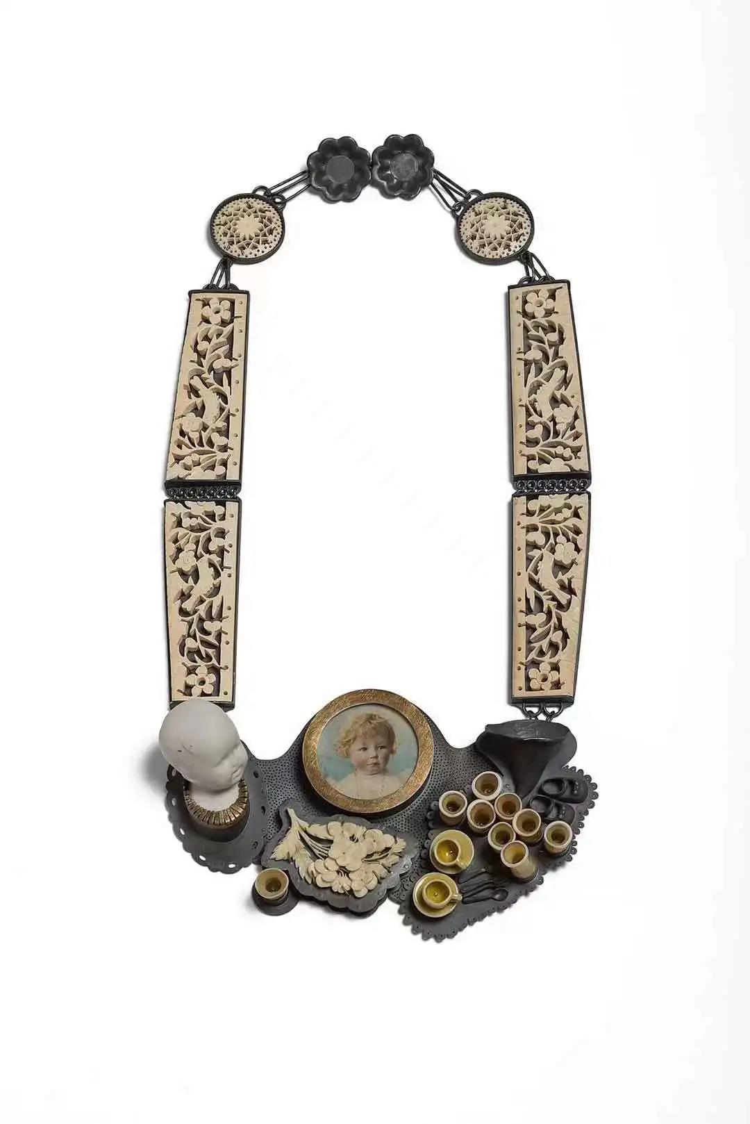 意大利首飾藝術(shù)家Barbara Paganin的作品大量地使用現(xiàn)有的物品來創(chuàng)作,通過主客觀時(shí)間關(guān)系的不斷交換,藝術(shù)家有效地檢驗(yàn)了串聯(lián)起生活和每個(gè)人記憶的作品的價(jià)值。在《記憶》系列作品中,陶瓷動(dòng)物、瓷娃娃、雕刻的象牙、森林、玻璃、出土、傳承和收集的舊照片的縮影與鞋子、衣服、日常使用的小工具和仿制寶石驚人混在一起。Paganin由此在作品中加持了層層的情感,在這個(gè)網(wǎng)中每個(gè)人都能找到自己的情感投射。每一枚胸針,每一條項(xiàng)鏈都在訴說一個(gè)故事,情節(jié)由我們來填充。