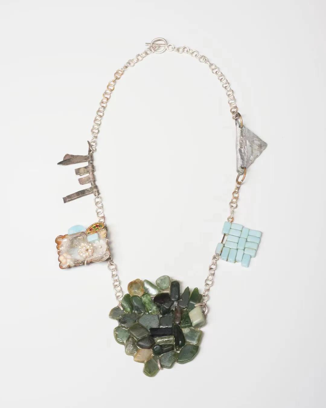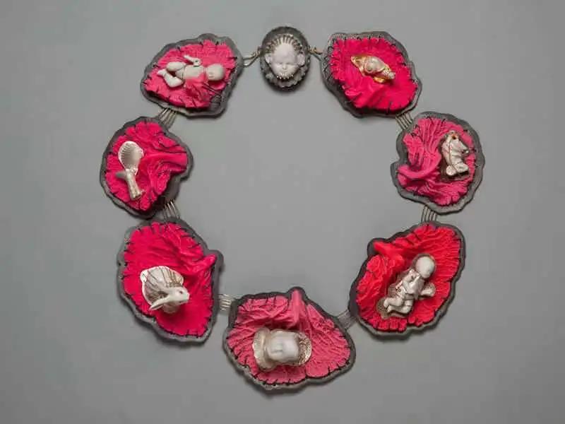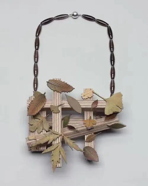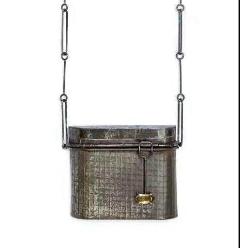 金屬是最常見的傳統(tǒng)首飾制作材料,然而,當(dāng)代首飾中,越來越多的藝術(shù)家通過非傳統(tǒng)的材料去創(chuàng)作首飾;比如回收的硬幣、瓶蓋、老化的金屬配件、老舊毛巾、手提電話和洋娃娃部件。這些東西舍棄原本的功能,與柔和的色彩結(jié)合變成一件件項(xiàng)鏈、吊墜盒手鐲。這是一個(gè)緊張的回收過程。物品本來要被扔掉或者遺棄,藝術(shù)家們經(jīng)過特殊的選擇讓它們以不同的方式回到生活中。