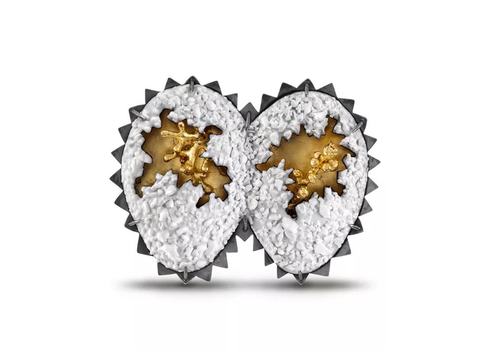 荷蘭與弗蘭德藝術(shù)史學(xué)家Nichka Marobin 在2017-2018間策劃,由Hannah Gallery(by Klimt02)呈現(xiàn)的展覽The Alchemical Egg上,四位受邀的首飾藝術(shù)家通過(guò)遵循黑化(nigredo)、白化(albedo)和赤化(rubedo)通過(guò)使用火、金屬與琺瑯來(lái)重塑當(dāng)代煉金術(shù)的道路,讓我感到無(wú)比震撼。四位藝術(shù)家在材料、視覺(jué)形式、心理學(xué)、神話隱喻等不同的方面將創(chuàng)作的發(fā)展推到極致。在思維的無(wú)窮無(wú)盡中,不斷的突破創(chuàng)作的可能性。