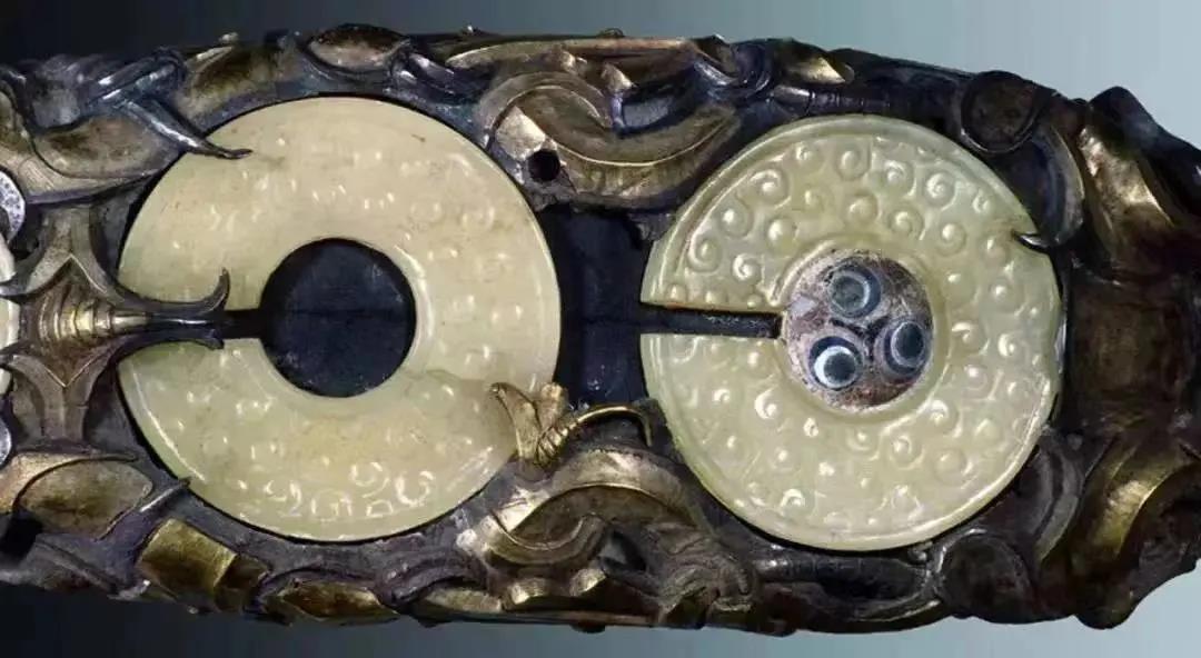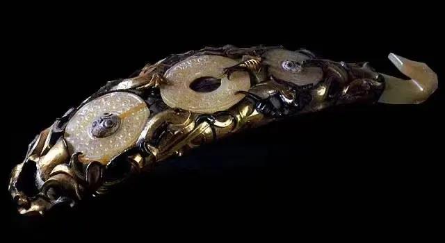 “包金鑲玉銀帶鉤”正是這一時期利于鎏金工藝和鑲嵌工藝制成的一件做工精細(xì)、華麗的典型帶鉤。此時我國的鑲嵌技術(shù)中已經(jīng)將當(dāng)今的爪鑲工藝和雕刻造型結(jié)合的精巧絕倫。從這件帶鉤中,我們完全可以一窺我國戰(zhàn)國時期鑲嵌技術(shù)的制作工藝與水平。