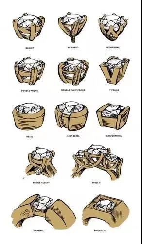 根據(jù)爪數(shù)量的多少,爪鑲可以分為兩爪、三爪、四爪、五爪、六爪和八爪,其中馬眼形寶石常用兩爪鑲嵌,水滴形(梨形)寶石常用三爪或五爪鑲嵌;四爪和六爪是寶石鑲嵌中最為常見的。