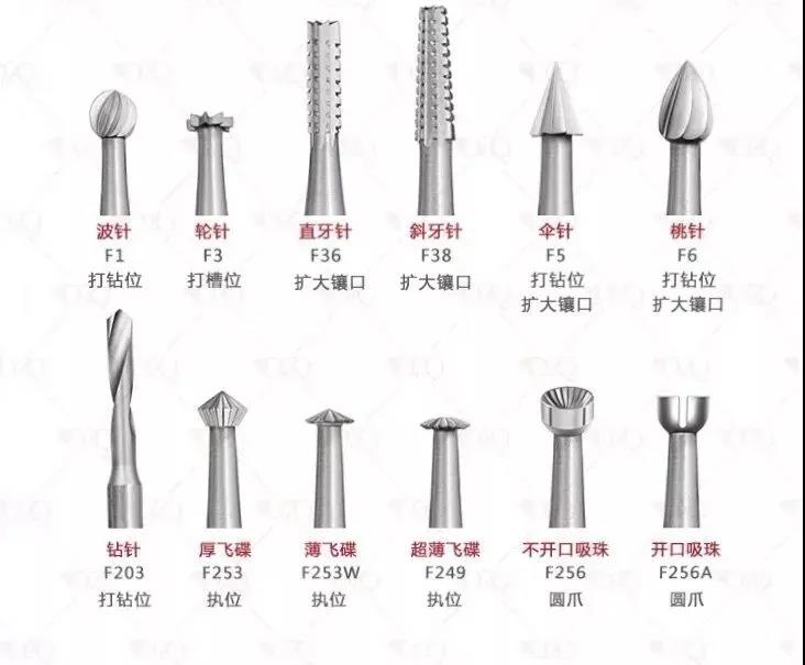 牙針——機用為主,分平頭與尖頭兩類。主要用于將一些凹凸不平的部位掃順,使得被清理的部位線條清晰。也經(jīng)常使用開夾層、穿孔等。也可以用于清潔包鑲位置的邊邊角角。