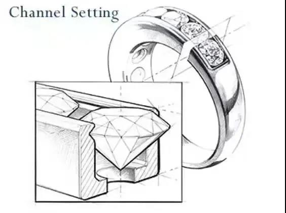 軌道鑲嵌也是鉆戒鑲嵌樣式中的經(jīng)典方式,又稱為逼鑲、迫鑲、夾鑲或是槽鑲。軌道鑲嵌可以和抓鑲結(jié)合,將單顆鉆石鑲嵌起來,也可以將一顆顆連續(xù)鑲嵌在金屬軌道中,利用在金屬托架上車出的溝槽兩邊金屬張力來穩(wěn)定鉆石的,凸顯鉆石的光芒。