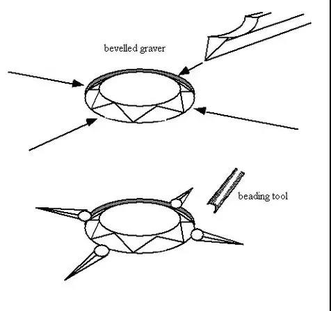 起釘鑲是指使用鋼針磨成的小鏟鏟起金屬片,經(jīng)過進一步鏟撥形成聚攏的金屬小丘,吸珠后成為頂部圓亮的小釘,再通過對小釘?shù)臄D壓而固定寶石的方法。