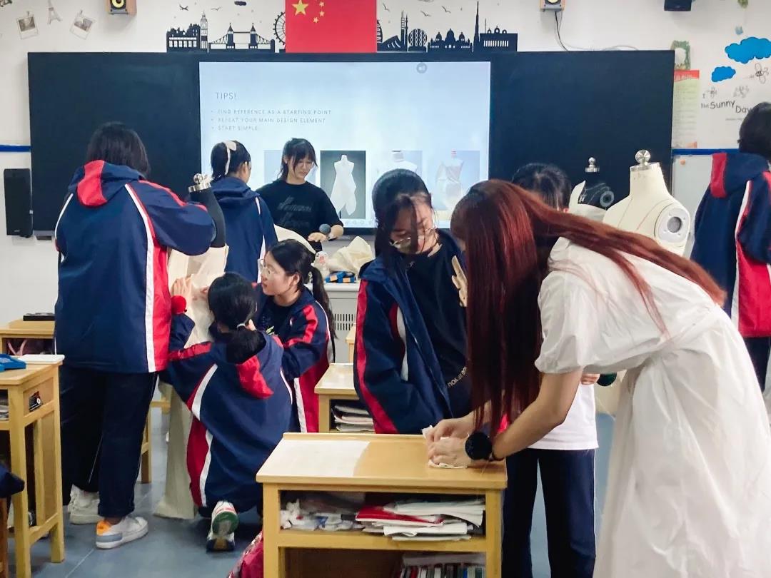 為了讓同學(xué)們有機(jī)會(huì)走進(jìn)服裝設(shè)計(jì)的背后,AIVA的老師們特地將一個(gè)“簡易服裝工作室”搬入江陰一中國際部的高二教室,帶大家親手實(shí)踐服裝設(shè)計(jì)中專業(yè)而重要的造型手法——立體剪裁。