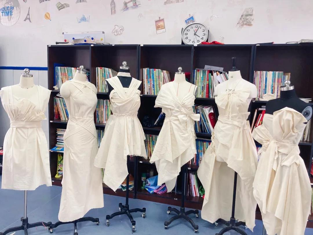 大家分為2-4人的小組,拿到人臺(tái)、白布和工具后,就開始了從零的創(chuàng)作。同學(xué)之間熱烈討論,不斷地嘗試和修改,逐漸找到了方向:褶皺多變的抹胸裙、簡易線條的禮服裙、可愛活力的吊帶長裙,獨(dú)具風(fēng)格的“維多利亞的秘密裙”......通過結(jié)合學(xué)習(xí)到的剪裁方法,同學(xué)們用布展示獨(dú)特的想法,創(chuàng)作出了讓人驚喜的作品。
