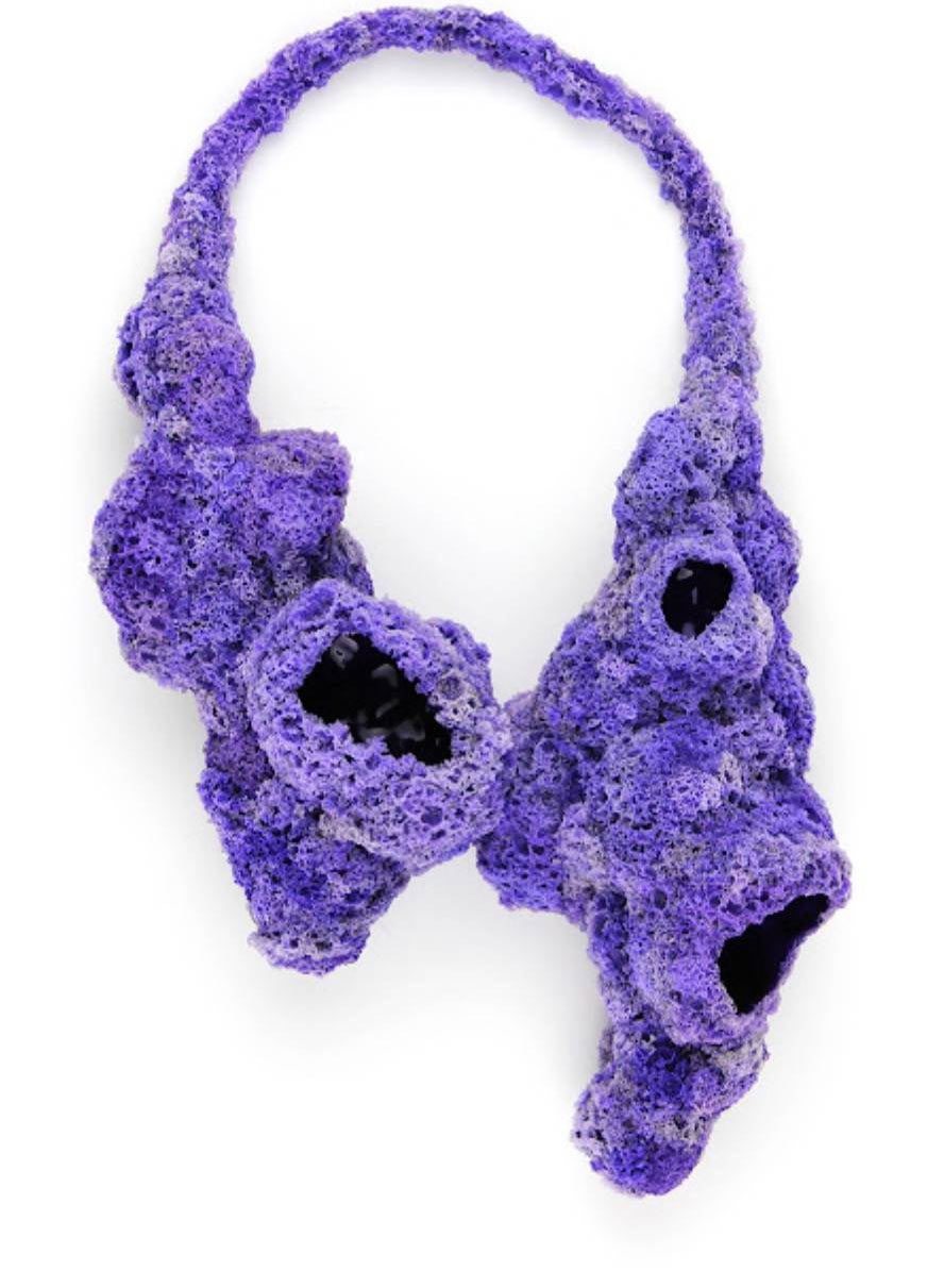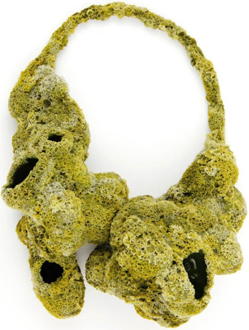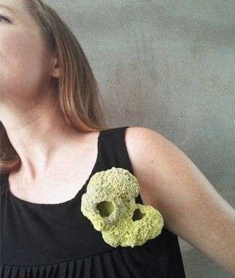 Malene Kastalje的首飾有一種珊瑚礁石的質(zhì)地,觸覺(jué)上卻是具有迷惑感。硅膠被塑造成疏松多孔的形狀,鮮艷的單色,石頭的外形,使人不由自主的被吸引。而硅膠這種材料,又將觀眾的猜想推開,給人一種觸感上陌生感。堅(jiān)硬與柔軟,平滑與多孔,是Malene Kastalje對(duì)于硅膠這一材料創(chuàng)造性的運(yùn)用。